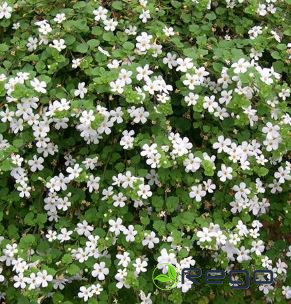 kas noklāta ar baltiem ziediņiem zvaigznītes formā.