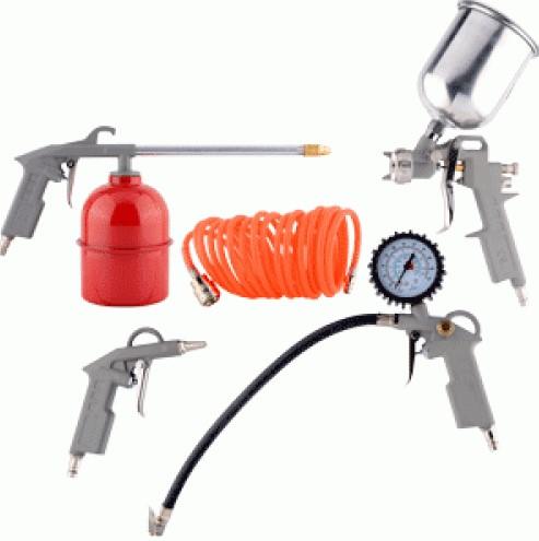 Tiek pielietots lakas un krāsasun aizsargpārklājumu uzklāšanai, riepu sūknēšanai,automašīnu mezglu un agregātu caurpūteikā arī mazgāšanai zem spiediena.Visas detaļas apgādātas ar ātri noņemamiem savienotājiemar izmēru 1/4″.Pieslēgšanai pie gaisa kompresora komplektāir spirāles šļūtene ar garumu 5 metri.Piegādāts atsevišķā kartona kastē.