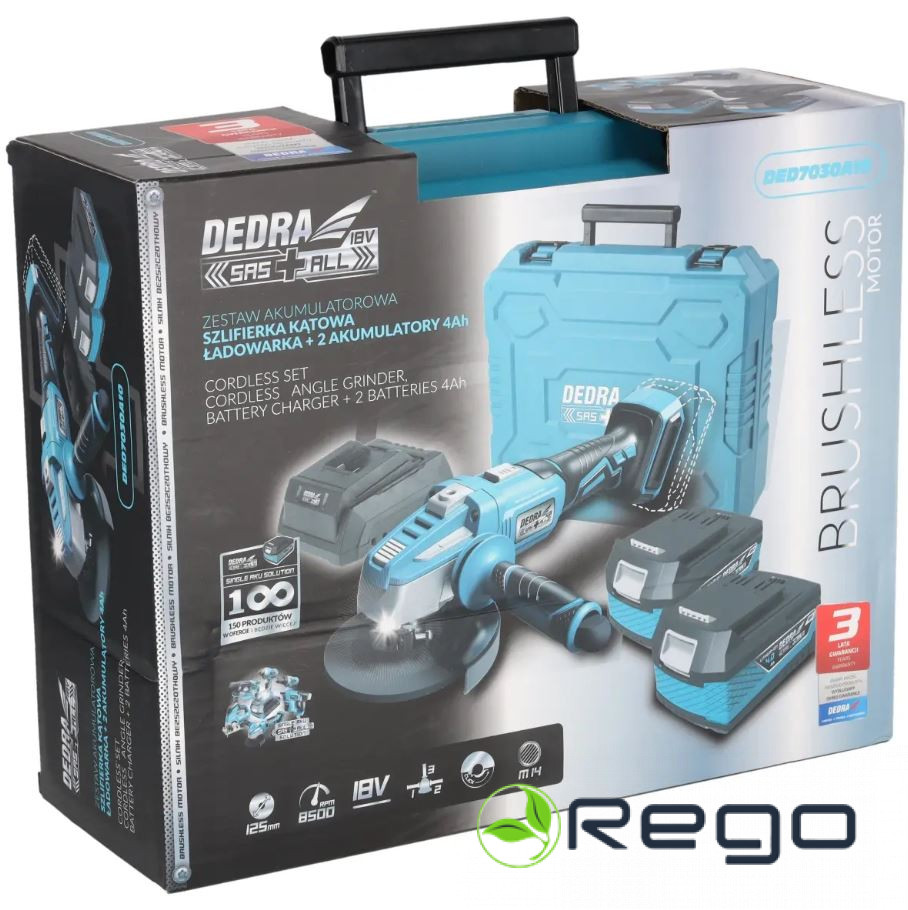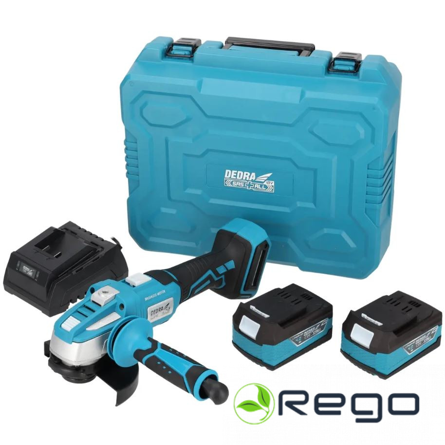 KomplektāBezoglīšu leņķa slīpmašīna DED7151,Maksimālais ātrums [apgr./min] 8500divi 4Ah akumulatori, lādētājs
