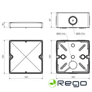 Garums: 101 mmPlatums: 101 mmDziļums: 47 mmAizsardzības pakāpe: IP66Kabeļu ievada veids: Blīvējoša membrānaHalogēnus nesaturošs: jāKrāsa: MelnsVāka piestiprināšana: SkrūvējamsMateriāls: PlastmasaForma: Kvadrātisks