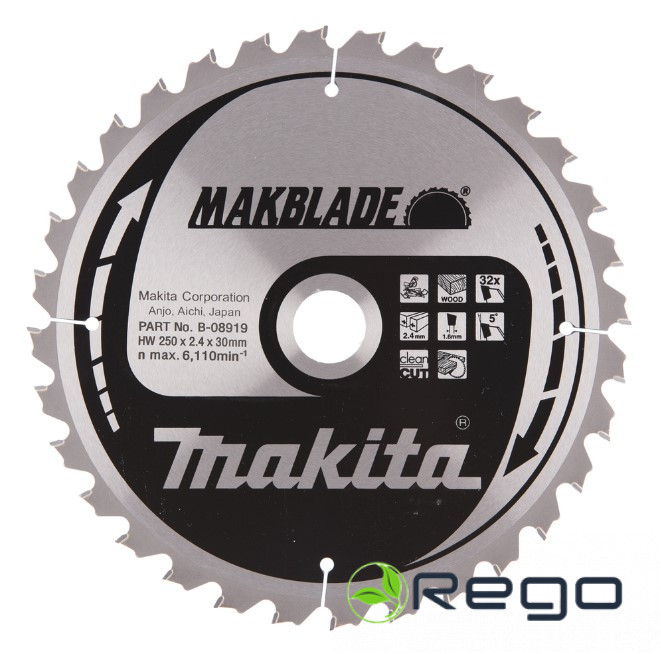 T.C.T. Zāģripa Kokam 250X2.4X30mm 5° T32 MAKBLADEAsmens diametrs: 250 mmZoba platums (griezuma platums) 2,4 mmZobu daudzums: 32Atveres lielums (vārpstas diametrs) 30 mmgrābšanas leņķis: 5°Zāģripas veids: Makblade