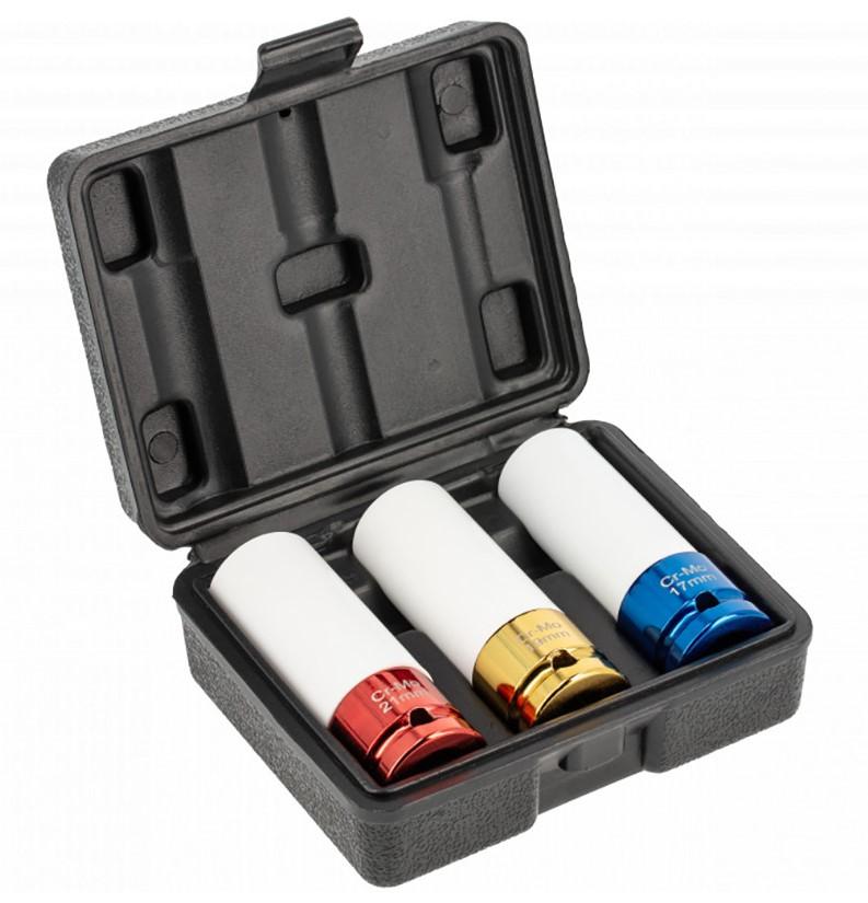 Izgatavots no augstas kvalitātes CrMo leģētā tērauda,kas nodrošina ilgu kalpošanas laiku, izturību un izturībupret deformāciju un plaisāšanu; izturīgs, paredzētsnepārtrauktai darbībai pie lielas slodzes; krāsaina ligzduapdare, kas nodrošina ātru izmēru noteikšanu;aizsarguzmava no mīksta materiāla pasargā lokus noskrāpējumiem un citiem bojājumiem; plastmasaskaste ērtai uzglabāšanai.Muciņas izmērs, mm 17; 19; 21Skaits iepakojumā 3Muciņas stiprinājums, collas 1/2″