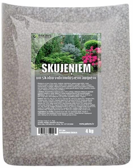 Mēslojums skujeņiem un skābu vidi mīlošiem augiem.Ar zemu hlora saturu, skujkoku mēslošanai, padara augsniskābu. Ideāli piemērots eglēm, priedēm, tūjām, kadiķim, īvē˙m,ciprešiem, lapeglēm, viršiem, virsājiem, rododendriem unacālijām. Mēslojuma sastāvs nodrošina pareizu augu augšanuun attīstību, labu ziemcietību.Sastāvā esošie magnijs un dzelzs garantē skaistu,sulīgu, piepildītu nokrāsu augiem.Mēslojums novērš skuju brūnēšanu.