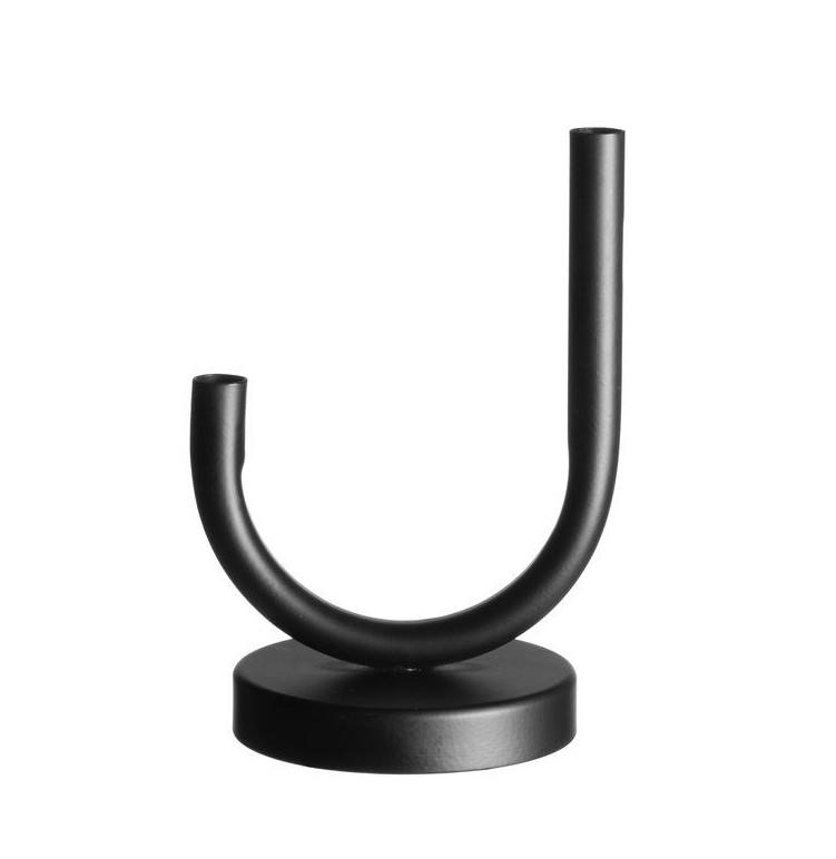 Minimālistisks acu piesaistītājsdivām tievām, konusveida svecēmŠis modernais svečturis apvieno izliektu siluetuar matēti melnu metāla apdari, radot mūžīgu priekšmetu,kas jebkurai telpai piešķir eleganciTā kompaktais un izturīgais dizains padara to parlielisku izvēli gan svētku galda klāšanai,gan ikdienas interjeramIzmēri: 12,5 x 10 x 18 cm.
