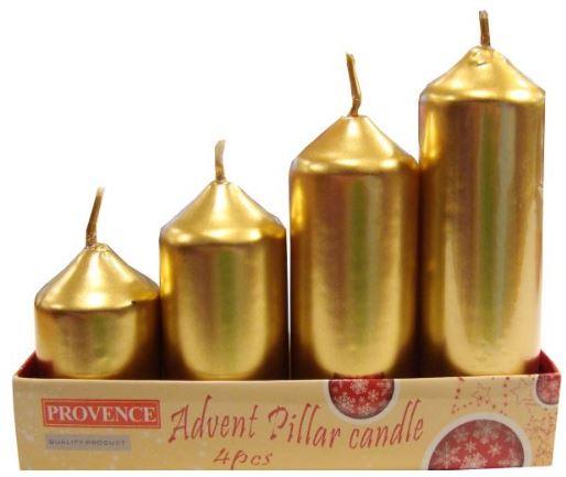 ProvenceAdventes sveces/ zelta krāsasSveču izmēri: Ø4×6.5;8.5;10;12cmKomplektā: 4 dažāda izmēra svecesKomplekta izmērs:17x12x4cm