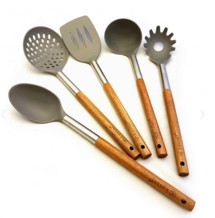 Virtuves piederumu komplekts, kas izgatavots no akācijas koka un termoplastiska neilona.Produkti nesaskrāpē trauku virsmu,tāpēc tie ir piemēroti arī teflonam. Neilonadetaļa, kas izturīga pret temperatūru līdz 200 grādiem.Estētiska meistarība, minimālisma dizains.Dabīgais koks un pelēkā apdare izskatās elegantiun rotās jebkuru virtuvi.