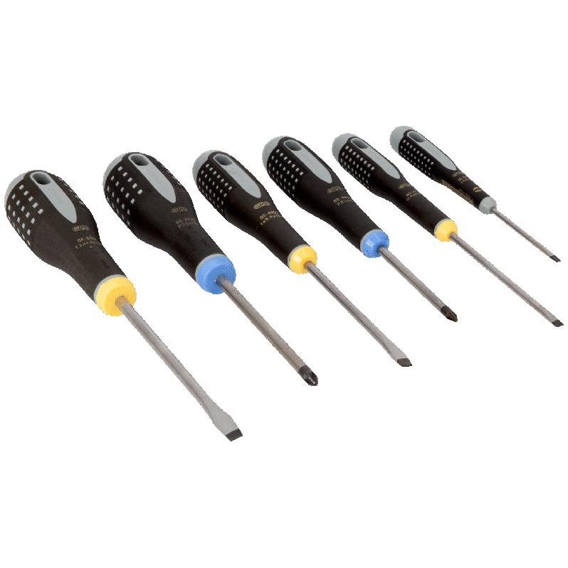 PH1 x 75, PH2 x 100, PZ2 x 100, T20 x 100, T25 x 125;izolēts skrūvgriezis 0,5 x 3,0 100Skrūvgriezis izstrādāts saskaņā ar zinātnisko ERGO procesuMelnā oksīda uzgalis lielākai precizitāteiTrīskomponentu rokturis maksimālam lietotāja komfortam,mīksts materiāls ar izciļņu virsmu nodrošina izcilusaķeri un lielāku spēka pārvadiMaksimāls komforts ar minimālu piepūli, pateicotiesergonomiskajam dizainam SL3,0 1000V VDE; T20/25; PZ2;…