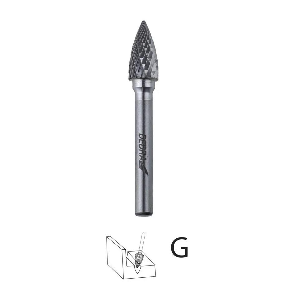 DEDRA 07F662 frēzes īpašības:Augsta frēzes cietība – izturība pret abrazīvu nodilumu.Universāls – metāla, alumīnija, plastmasas apstrādei.Dubultas iegriezumi uz darba uzgaļa –viegla skaidu noņemšana apstrādājamās detaļāsDEDRA 07F662 frēzes tehniskie dati:Tips: ass smailais [G tips]Darba materiāls: volframa karbīdsDarba uzgaļa garums: 25 mmDarba uzgaļa diametrs: 12 mmGalviņas diametrs: 6 mmMaksimālais ātrums: 30000 APGR.