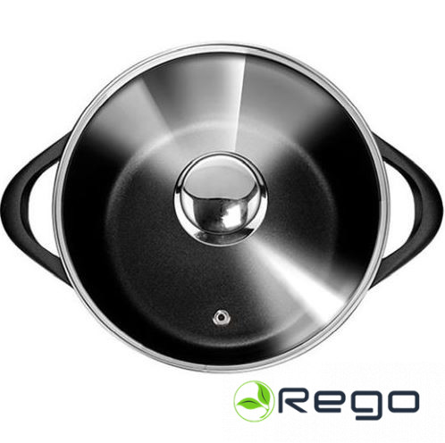 ar tērauda rokturiem un atverēm tvaika izvadīšanai.