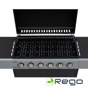 Gāzes grils ar 6 nerūsējošā tērauda degļiem.Degļa jauda 6 x 2,8 kW. Kopējā jauda 16,8 kW.Grilēšanas laukums 72 x 36 cm,dalīts ar 3x 24 x 36 cm emaljētu tērauda grila restīti.Liesmas pieradinātāji virs degļiem, 6 gab.Vāks, vadības panelis, priekšējais panelis un ratiņino pulverkrāsota tērauda.Smērvielu paliktnis no cinkota tērauda zem ugunskura kastesCentrālajā vadības pogā iebūvēta pjezo…
